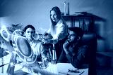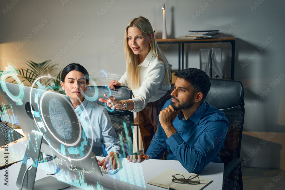 Team Of Professionals Analyze Futuristic Data With Holographic Interfaces In Modern Office During Collaborative Strategy Session