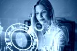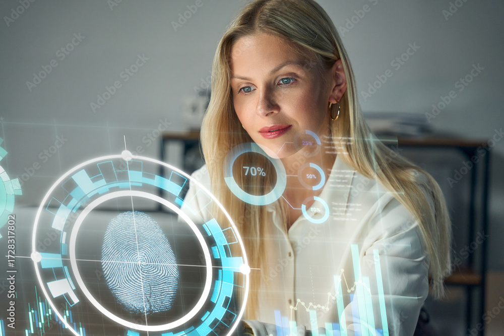 Modern Businesswoman Using Biometric Security Interfaces And Data Analytics Dashboards In A High Tech Office Environment With Fingerprint Scan Visualization