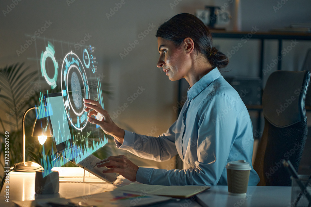 Businesswoman Interacting With Futuristic Holographic Interface At Desk In Modern Office Environment Data Security Visualization