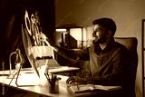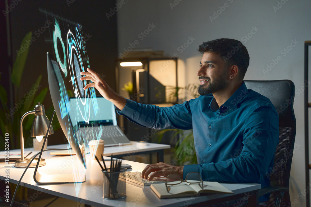 Modern Tech Professional Working With Futuristic Holographic Interfaces In A Bright Office At Night