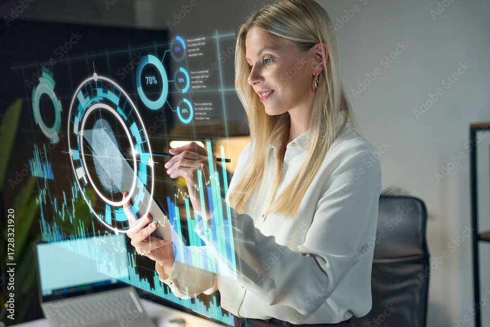 Businesswoman Interacting With Futuristic Holographic Interface For Data Analytics And Digital Security Visualization In Office