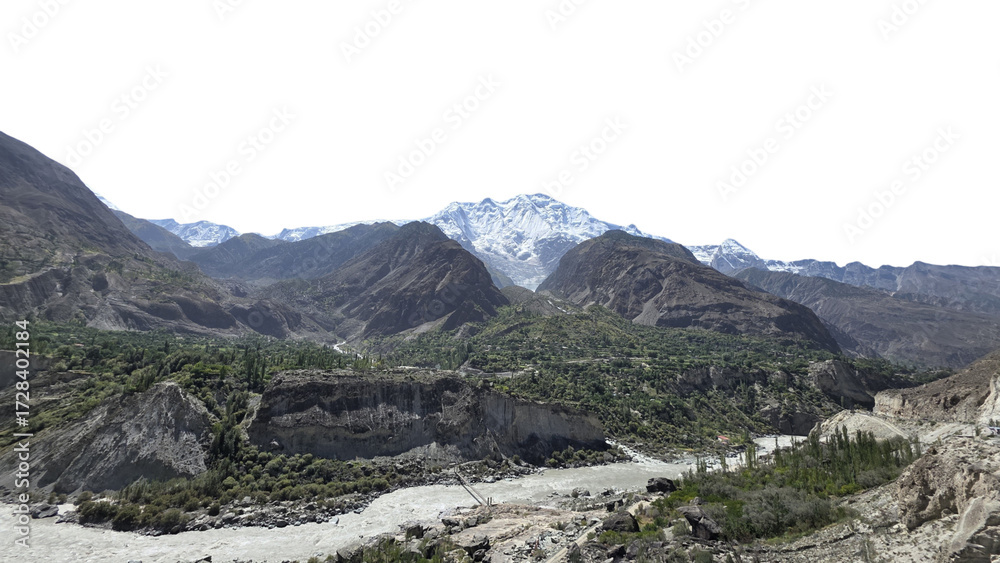 Rakaposhi Mountain in Gilgit Isolated on a White Background with Copy Text Space. Majestic Landscape Element for Travel Posters, Cultural Themes, and Nature-Inspired Designs. PNG File