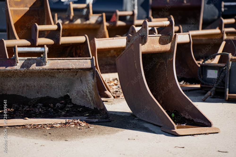 Collection of excavator buckets with visible rust and wear showing reinforced steel construction, curved digging blades and mounting joints designed for soil excavation, loading and industrial earthmo