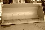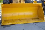 Large yellow front loader bucket made of reinforced steel, showing smooth welded structure and precision design used for material transport, earthmoving and construction machinery operations