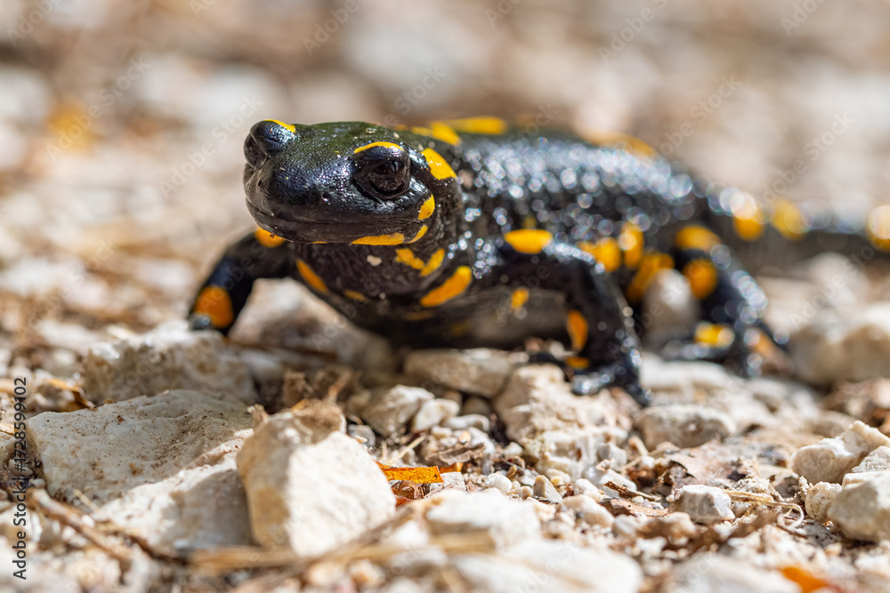Close-up of a Fire Salamander (Salamandra salamandra) with vivid yellow spots on black skin, resting on a rocky forest floor in its natural habitat.