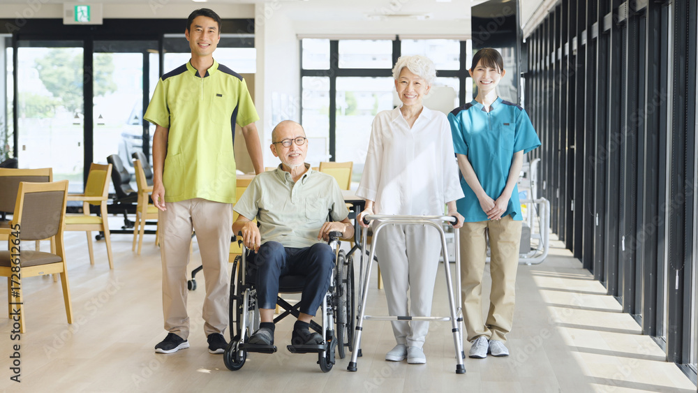 高齢者の歩行サポートをするアジア人介護士