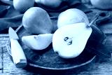 Fresh ripe pears and knife on wooden table, closeup
