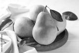 Fresh ripe pears and green leaves on white wooden table, closeup