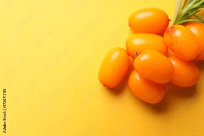 Ripe sea buckthorn berries on yellow background, flat lay. Space for text