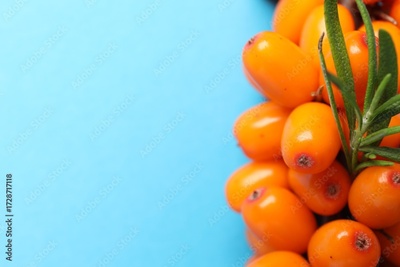 Ripe sea buckthorn berries and leaves on light blue background, above view. Space for text