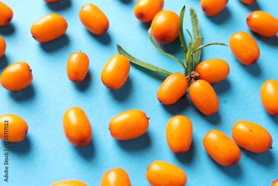 Ripe sea buckthorn berries and leaves on light blue background, flat lay