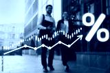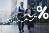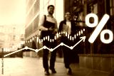 Business partners walking outdoors. Percent sign, arrow and graph