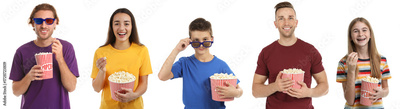 Visiting cinema. Different people with buckets of popcorn on white background, collage of portraits