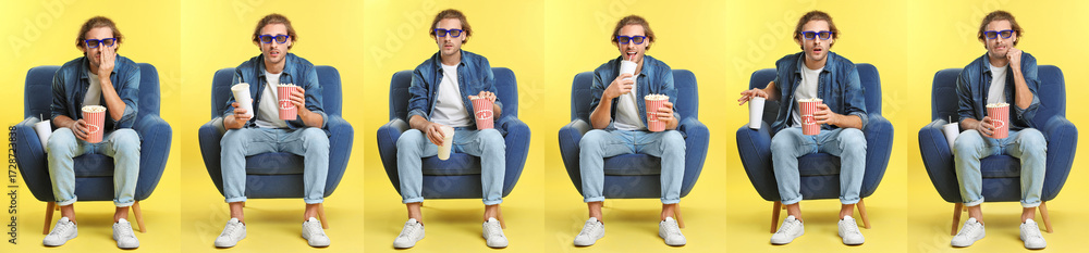 Visiting cinema. Man with bucket of popcorn on yellow background, collage of portraits