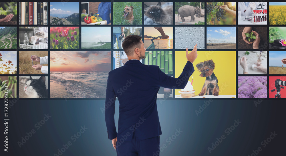 Man searching video in media library on virtual screen