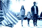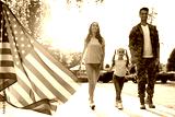 Military man walking with his family outdoors, double exposure with national flag of USA