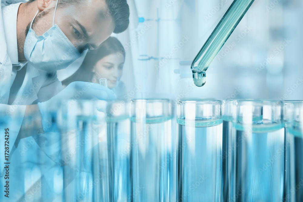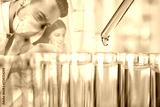 Laboratory analysis. Dripping reagent into test tube, double exposure with scientists