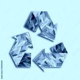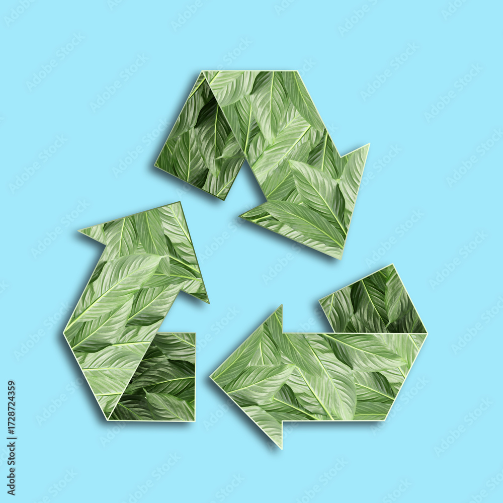 Recycle sign. Chasing arrows with pattern of green leaves on light blue background