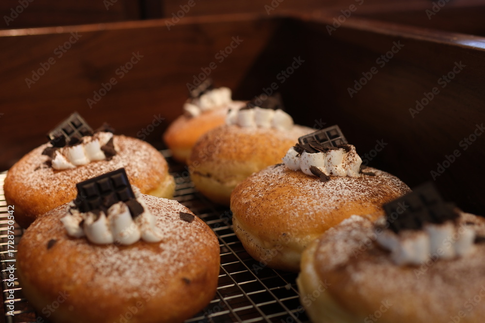 doughnuts scene - mix of multicolored sweet donuts with sprinkel on blue background. High quality photo