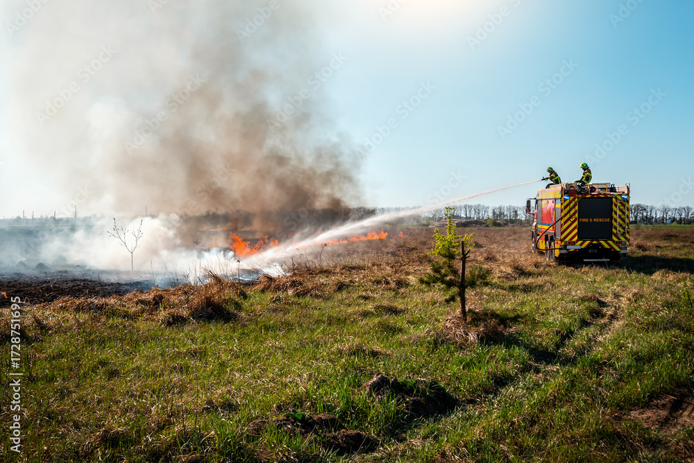 Firefighters with fire trucks extinguishing wildfire in dry rural field in sunny day