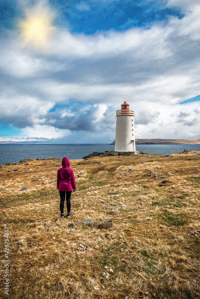 Tourist in pink jacket is looking on Skarsviti lighthouse in Vatnsnes peninsula on a clear day in North Iceland