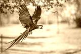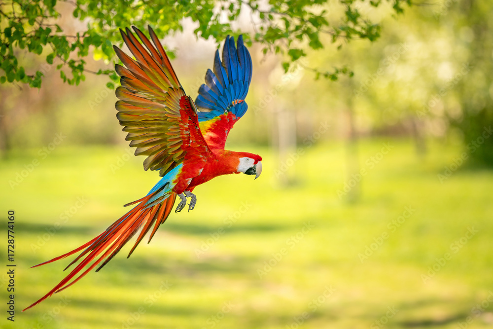 Brilliant Scarlet Macaw Flying Gracefully Over a Lush Green Forest Scene