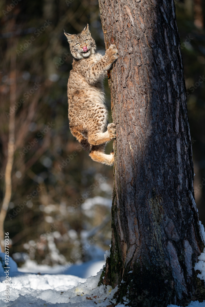 Wild Lynx Climbing a Tree in a Snowy Forest on a Sunny Day