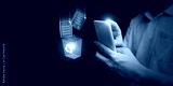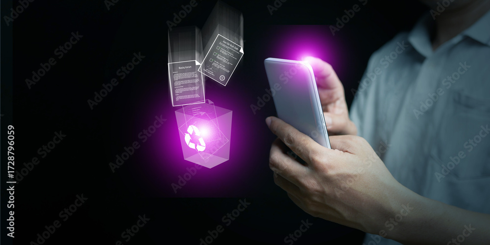 Man using smartphone with glowing hologram recycle bin, deleting digital files and managing documents securely in futuristic technology concept