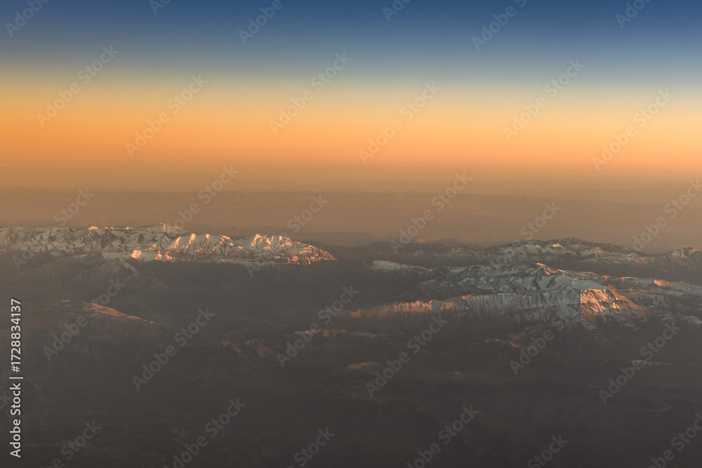 High Atlas Mountains in Morocco seen from airplane – aerial view of dramatic peaks and rugged landscape