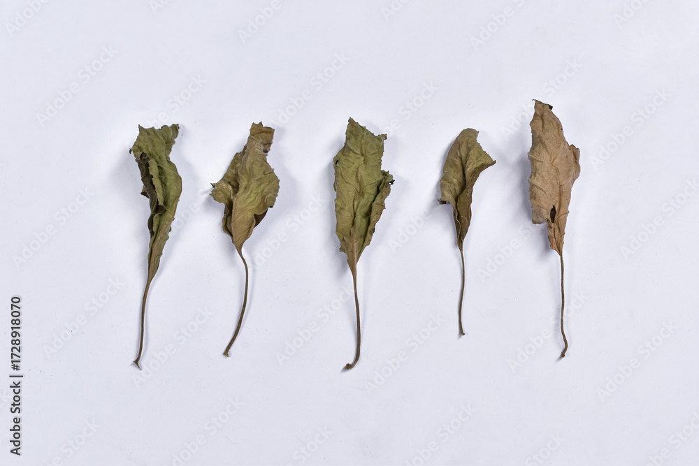Patchouli leaves (Pogostemon cablin) on a white background. Patchouli leaves are the base ingredient for essential oils. Dry or dead leaves