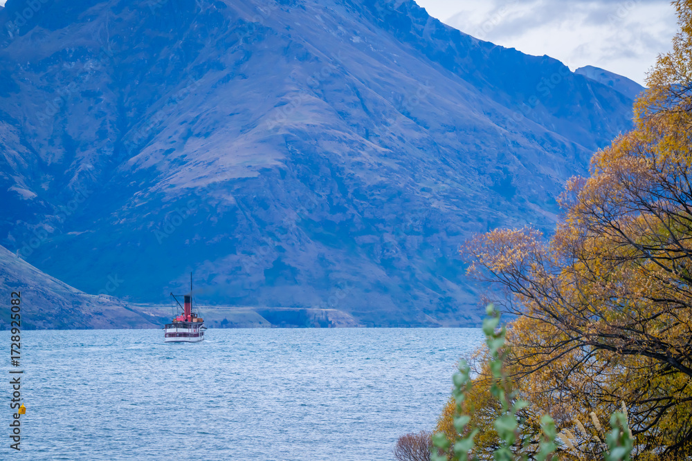 beautiful scenic view of colorful autumn leaves tree in the city with ducks , cruise , park ,people , snow cap mountain ,Queenstown south island New Zealand