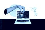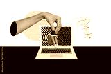 Collage portraying laptop computer smartphone addiction manipulation through digital lies hypnotic propaganda illusions