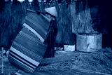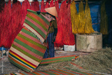 Vietnamese woman in traditional straw hat dries dyed reeds for production of woven mats at factory in artisan village in Vietnam. An Cu, Tuy An, Phu Yen province, Vietnam - April 14, 2025