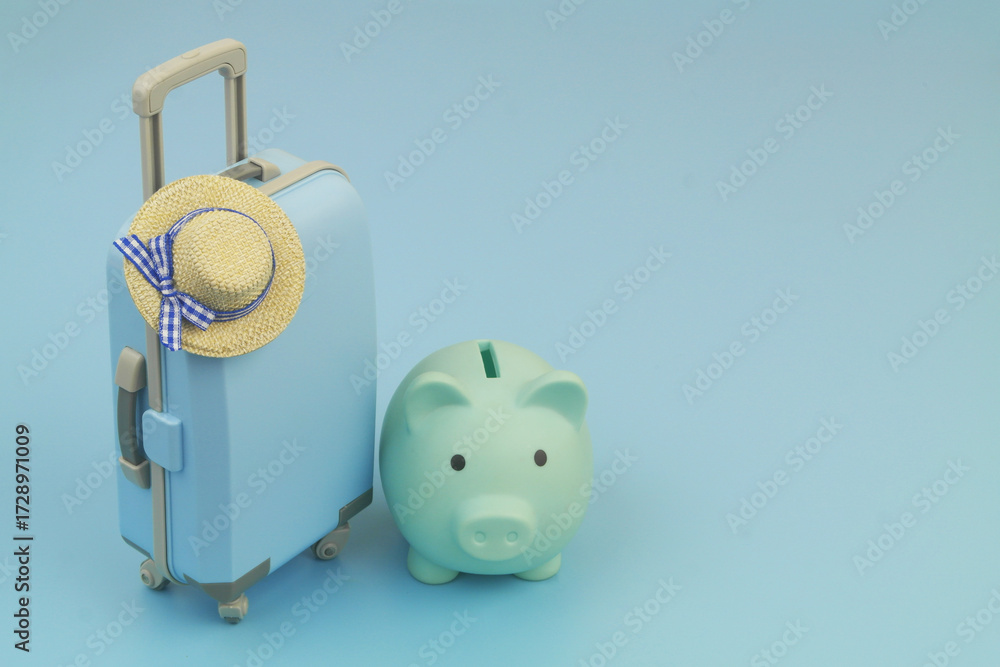 Travel suitcase with beach hat and piggy bank on blue background. Copy space for text. Travel budget concept.