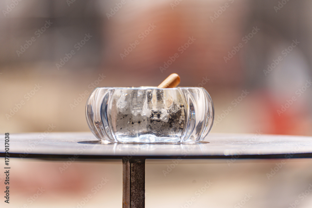 Single cigarette rests in glass ashtray on metal outdoor cafe table