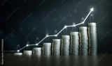 Stacks of coins with glowing rising arrow line, symbolizing financial growth, investment, profit, and economic success. Perfect for banking, finance, savings, and wealth management concepts.