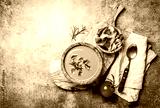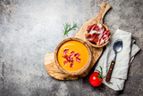 Spanish tomato soup Salmorejo served in olive wooden bowl with ham jamon serrano on stone background. Top view, copy space