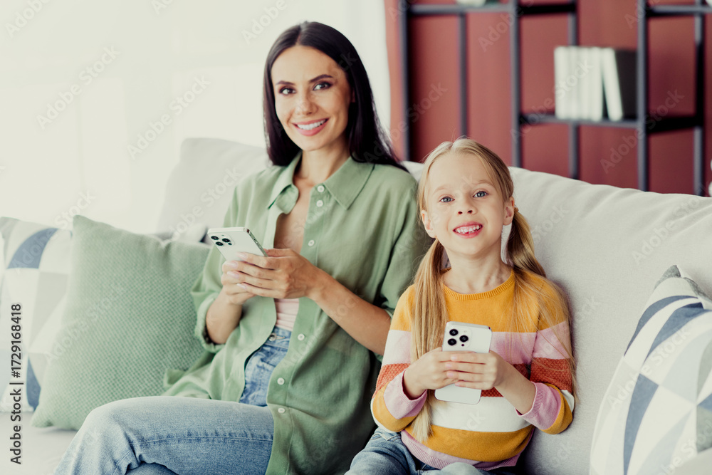 Happy mother and daughter bonding on the sofa with smartphones in a home living room environment