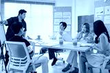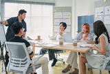 Business leader facilitates strategic hackathon utilizing AI-powered analytics and cross-functional collaboration to drive digital transformation through agile methodologies and data-driven innovation