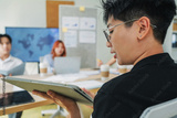 Female executive leads strategic brainstorming session using flipchart methodology, facilitating cross-functional ideation with business partners through data-driven innovation and agile frameworks