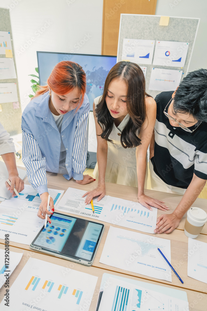 Topview business meeting shows financial startup documents, charts and strategic planning papers while diverse team brainstorms innovative ideas for scalable growth and market expansion goals
