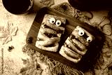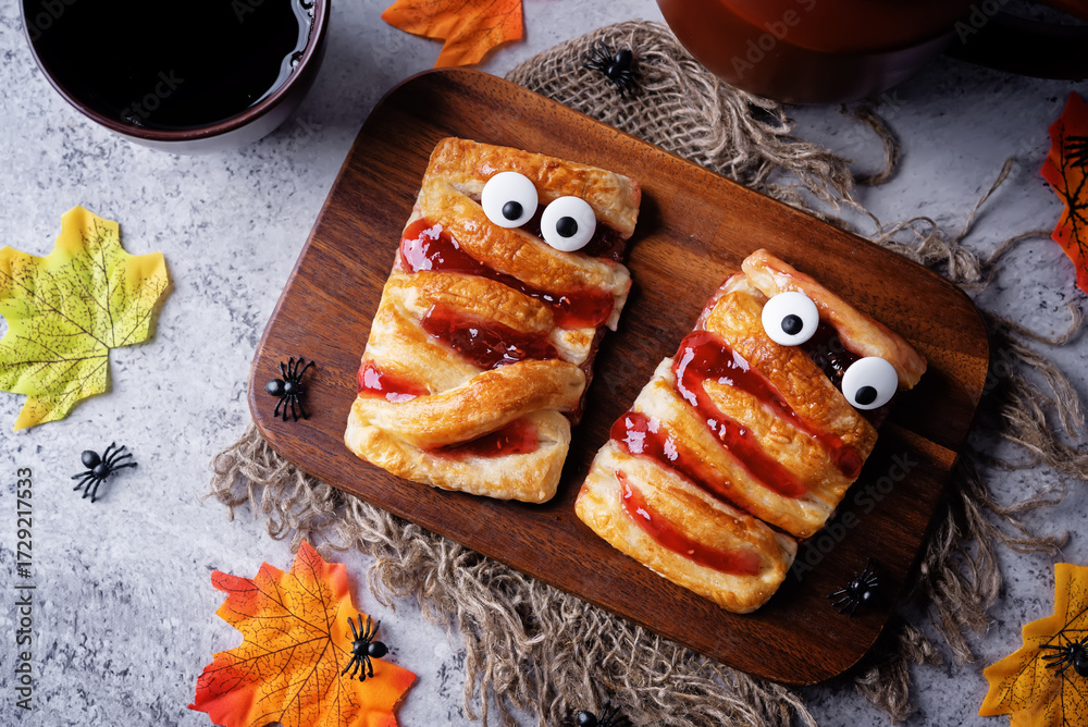 Puffed cakes with raspberry jam in the form of mummy for Halloween holidays