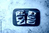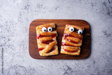 Puffed cakes with raspberry jam in the form of mummy for Halloween holidays