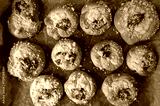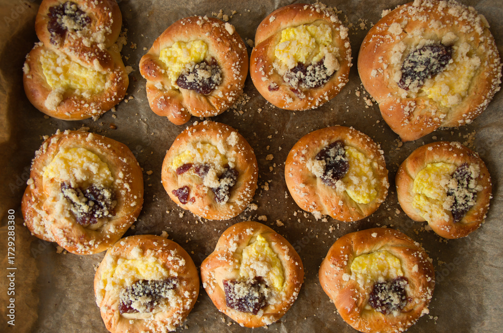 Taca ze złocistymi, domowymi bułeczkami duńskimi nadziewanymi serkiem śmietankowym i dżemem owocowym, posypanymi kryształkami cukru. Ciepłe, zachęcające smakołyki idealne na słodki deser lub brunch.