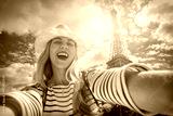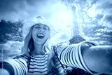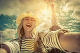 Woman tourist selfie near the Eiffel tower in Paris under sunlig