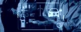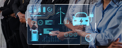 A professional group stands together with a digital overlay showcasing electric vehicle graphics and clean energy data, embodying innovation and teamwork for a sustainable future. Trope