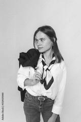 A modern businesswoman in a white shirt, blue jeans, a jacket, and a scarf on a gray background.