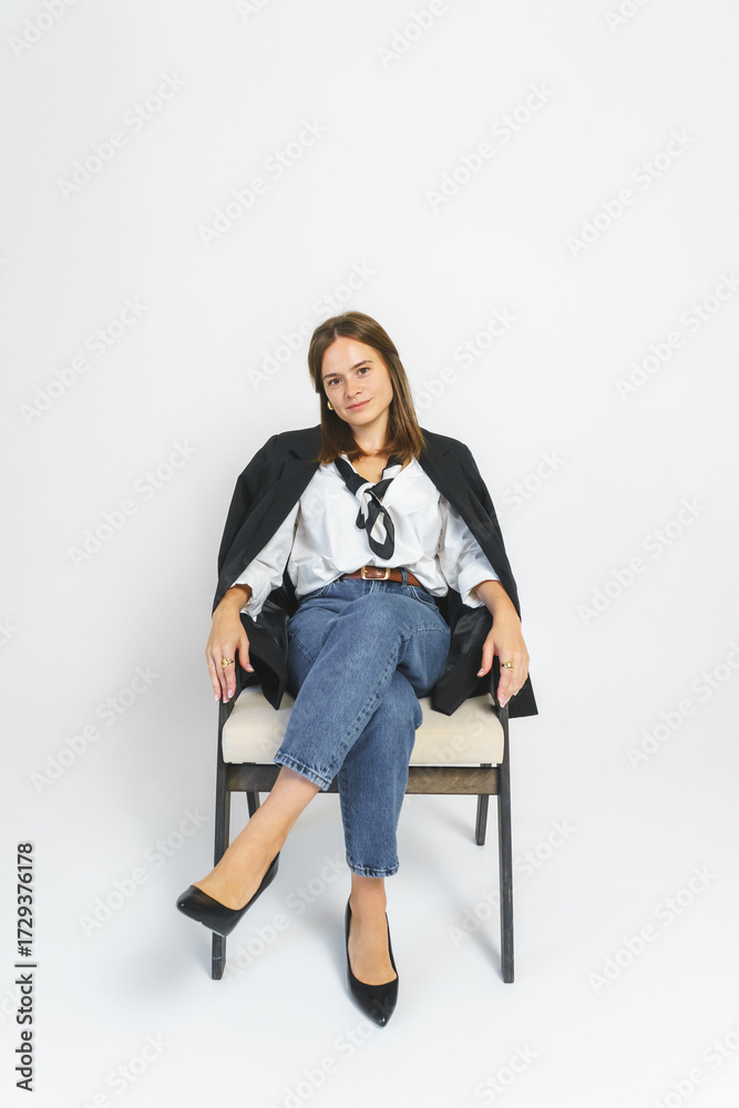 A modern businesswoman in a white shirt, blue jeans, a jacket, and a scarf sits on a chair against a gray background