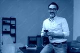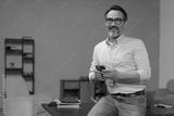 A cheerful middle-aged man sits casually on a desk in a contemporary office, engaging with his smartphone. He sports glasses and a friendly smile, surrounded by minimalist decor