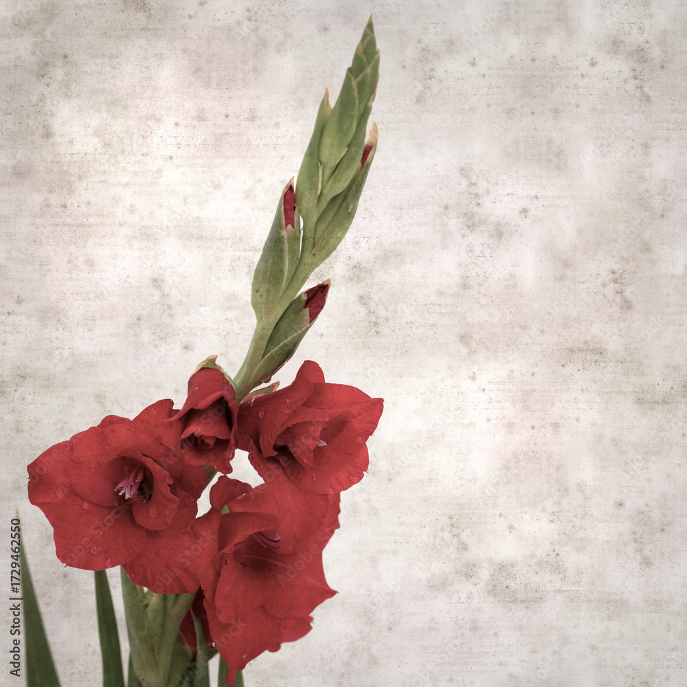 textured stylish old paper background, square, with dark red gladioulus, sword Lily